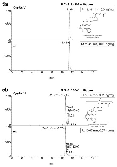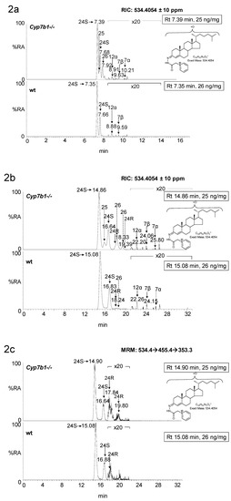 As mentioned in Section 3.1.2, the level of cholesterol was measured in each of the mouse brains from both genotypes. Its precursor desmosterol and the 7-DHC isomer 8-DHC are also present in brain but at much lower levels (see Supplementary Materials, Table S1). The limited dynamic range of the LC-MS system makes the simultaneous analysis of cholesterol and of its precursors challenging. As the main focus in this study was on oxysterols and not cholesterol precursors, these sterols were not investigated thoroughly. Nevertheless, the data from single animals suggest reduced levels of cholesterol precursors in brain of the Cyp7b1-/- animals. Further studies are required to confirm or refute this suggestion. Similarly, further studies are required to investigate the concentration in plasma of 12α-hydroxy metabolites, which in this work were detected but not measured in all animals. Their presence or absence in brain also requires further investigation.