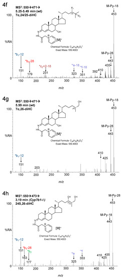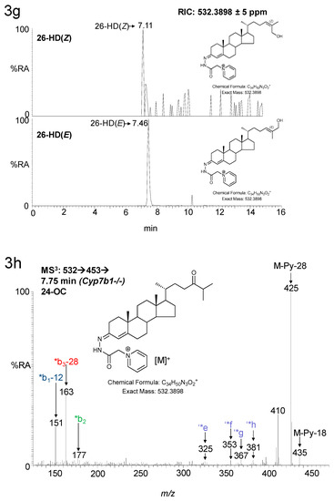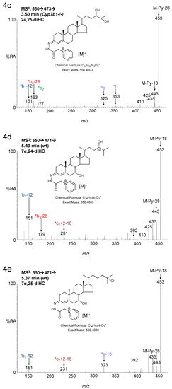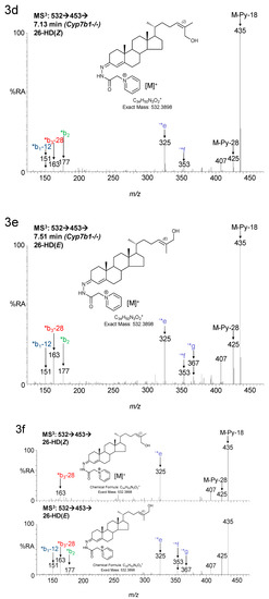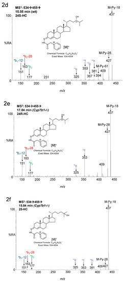 The following are available online at https://www.mdpi.com/2218-273X/9/4/149/s1, Figure S1: Schematic describing the principles of the EADSA method, Figure S2: MRM-like transition 534.4→455.4→353.3, Figure S3: Fragmentation scheme for 24-HC (see Figure 2d–e), Figure S4: Fragmentation scheme for 7-HC (see Figure 2h), Figure S5: LC-MS(MSn) analysis of 24H,25OMe-C in mouse plasma, Figure S6: LC-MS(MSn) analysis of monohydroxycholesterols in mouse plasma, Figure S7: LC-MS(MSn) analysis of dihydroxysterols in mouse plasma, Figure S8: LC-MS(MSn) analysis of cholestenoic acids in mouse plasma, Table S1: Concentrations of Oxysterols in Brain and Plasma of Cyp7b1+/+ and Cyp7b1-/- Mice.