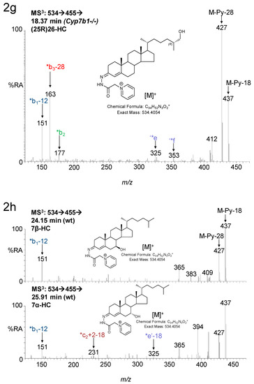 LC-MS(MSn) analysis of monohydroxycholesterols in mouse brain. Reconstructed ion-chromatograms (RICs) from analysis of Cyp7b1-/- (upper panel) and Cyp7b1+/+ (wt, lower panel) 23-month-old animals generated from (a) 17 min and (b) 33 min chromatographic gradients. (c) Multiple reaction monitoring (MRM) chromatogram (m/z 534.4→455.4→353.3, see Supplementary Materials, Figure S2) from Cyp7b1-/- (upper panel) and Cyp7b1+/+ (lower panel) animals generated from the 33 min chromatographic gradient. Magnification factors in chromatograms (a–c) are as indicated. Concentration of the analyte indicated by retention time is given in the right-hand corner of the chromatograms. MS3 spectra ([M]+→[M-Py]+→) of (d) 24S-HC from a Cyp7b1+/+ mouse and of (e) 24R-HC, (f) 25-HC, (g) 26-HC and (h) 7β-HC and 7α-HC, from a Cyp7b1-/- mouse. Many GP-derivatised sterols give syn and anti conformers which may or may not be chromatographically resolved. Generic fragmentation schemes are illustrated in Supplementary Materials, Figures S3 and S4.