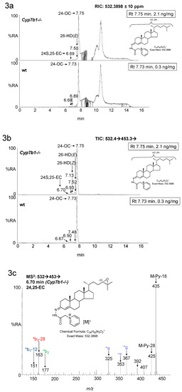 We previously reported the levels of 24S-HC, 24S,25-EC [14], 26-HC, 3β-HCA and the combination of 7α,26-dihydroxycholesterol (7α,26-diHC) and 7α,26-dihydroxycholest-4-en-3-one (7α,26-diHCO) (i.e., fraction a, [12]) in Cyp7b1-/- and Cyp7b1+/+ mouse brain but, at that time, did not analyse 25-hydroxylated sterols or other 7α-hydroxylated sterols, or oxysterols derived from cholesterol precursors. Here we report new data for these additional sterols. The complete data set is presented in Figure 1 and Supplementary Materials, Table S1.