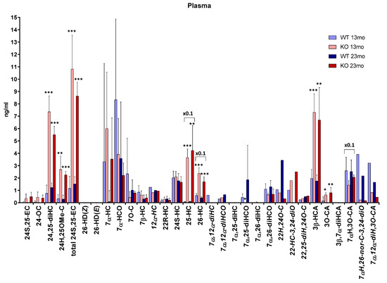 As in brain, the concentration of total 24S,25-EC is significantly higher (p < 0.001) in plasma of the Cyp7b1-/- mice (10.82 ± 2.74 ng/mL at 13 months, 8.63 ± 1.11 ng/mL at 23 months) than Cyp7b1+/+ mice (1.16 ± 0.98 ng/mL at 13 months, 1.52 ± 0.59 ng/mL at 23 months, Supplementary Materials, Figure S5). This is also true for 25-HC where the plasma concentration in the Cyp7b1-/- mice (36.52 ± 7.04 ng/mL at 13 months, 42.19 ± 20.21 ng/mL at 23 months) is also higher (p < 0.001 at 13 months, p < 0.01 at 23 months) than in the Cyp7b1+/+ mice (0.74 ± 0.24 ng/mL at 13 months, 0.85 ± 0.26 ng/mL, Supplementary Materials, Figure S6). Unlike the situation for 24S,25-EC, 25-HC and 26-HC [12], where plasma concentrations are elevated in Cyp7b1-/- mice, the concentration of 24S-HC does not vary between genotypes (in wt animals 2.02 ± 0.54 ng/mL at 13 months and 1.78 ± 0.58 ng/mL at 23 months). This is also true for the minor oxysterol 22R-hydroxycholesterol (22R-HC, in wt animals 0.17 ± 0.11 ng/mL at 13 months and 0.31 ± 0.21 ng/mL at 23 months).