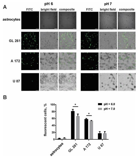 The specificity of internalization of the designed FA-Cyt c NP constructs by cultured glioma cells was tested by using FA-Cyt c NPs modified with fluorescein isothiocyanate (FITC) via the amine group. Human A172, U87, mouse Gl261 glioma cells, and mouse cultured primary astrocytes were treated with FITC–labeled FA-Cyt c NPs, added to the culture medium for a final concentration of 100 µg/mL (100 mg/mL stock solution was prepared by dilution of designed NPs in phosphate buffer saline (PBS)). Cells were cultured in neutral (pH = 7) and acidic (pH = 6) culture medium, optimal for PCFT activity. Confocal imaging of live cells revealed the robust accumulation of FITC fluorescence in GL261 and A172 cells after six hours of incubation with FITC–labeled FA-Cyt c NPs (Figure 1A). Astrocytic cells did not show any sign of uptake of NPs at this time point. Additionally, A172 and GL261 cells internalized NPs better in the acidic environment compared to the neutral pH (Figure 1B). U87 cells showed low uptake in both pH = 6 and pH = 7. An acidic pH of the cell culture medium did not significantly affect cell viability during the experiment (Figure S1).