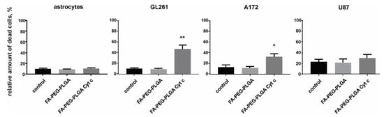 The results demonstrated 40% cell death for Gl261 cells and 30% cell death for A172, but not for astrocytes and U87 cells, in a 24-h treatment with FA-Cyt c NPs (Figure 2). The FA-PEG-PLGA exhibited no cytotoxic effects in the entire cell cultures investigated. Extended treatment with FA-Cyt c NPs for up to five days did not show any cytotoxic effect on astrocytes (Figure S2), confirming the specificity of the FA-conjugated nanoconstructs for GL261 and A172 cells.