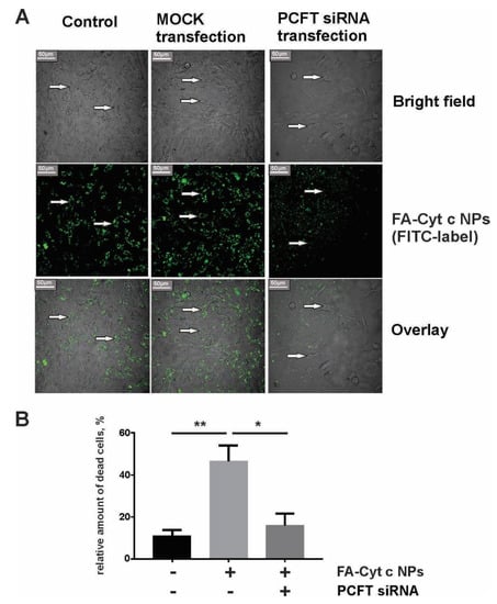 Internalization of FITC–FA-Cyt c NPs by GL261 cells transfected or untransfected with small interfering RNA (siRNA) against the PCFT. (A) Confocal imaging of live GL261 cells was performed after six hours of incubation with FITC-conjugated FA-Cyt c NPs. Control, MOCK-transfected (cells transfected without addition of siRNA) and PCFT siRNA-transfected cells are shown. Arrows indicate the localization of NPs in the cell cytoplasm. Scale bar, 50 µm. (B) A live/dead assay based on calcein and ethidium homodimer-1 staining of live and dead cells was performed for GL261 glioma cells, transfected or untransfected with siRNA against the PCFT, after 24 h of treatment with FA-Cyt c NPs (100 μg/mL). Quantitation of the number of dead cells as a percentage of the total number of cells is presented. Mean ± S.E. is shown. Asterisks ** and * indicate statistical significance at p < 0.001 and p < 0.05, respectively. N = 5 (N is the number of the experimental repeats per cell culture).