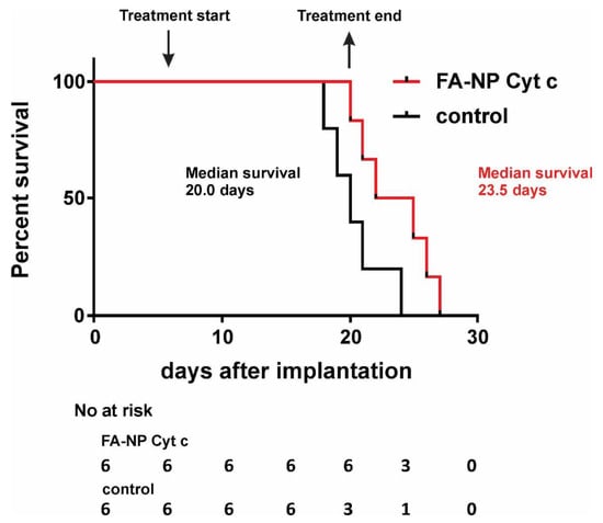 The efficacy of the FA-Cyt c NPs system was tested in a GL261/C57Bl/6 mouse glioma model. Previously, we reported that local in-tumor introduction of FA-Cyt c NPs led to the reduction of tumor size and the presence of signs of massive apoptosis in tumor tissue, but not in healthy brain parenchyma in GL261/C57Bl/6 model [7]. Here, survival analysis was performed (Figure 6). Two groups of glioma-bearing mice (six animals per group) received either FA-Cyt c NPs (100 mg/mL diluted in PBS) or vehicle (PBS). The drug was infused directly into the tumor, beginning on the 7th day after tumor implantation with the use of a mini-osmotic pump, installed subcutaneously, at 1 μL/h, over 14 days. The median survival in the group receiving FA-Cyt c NPs was 23.5 days after glioma implantation vs. 20 days in the control group. This difference of 3.5 days represents a 17.5% increase in survival in response to the FA-Cyt c NPs treatment.