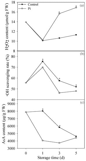 3.2. Effects of P. italicum Infection on H2O2 Content, ·OH Scavenging Rate, and AsA Content of Mandarin Peel