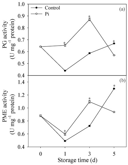 3.4. Effects of P. italicum Infection on PG and PME Activities of Mandarin Peel