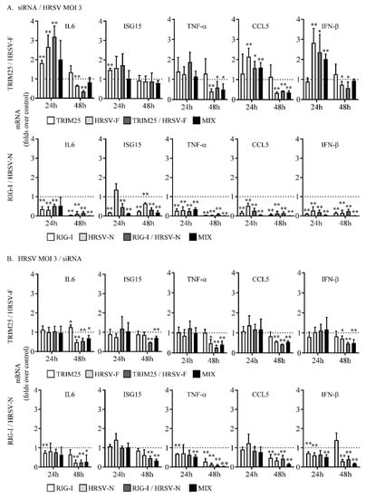 Relative levels of HRSV mRNAs (N, F, NS1, L, G, M, and P) in cells transfected with the different siRNAs. (A) Cells transfected with the siRNAs TRIM25, HRSV-F, TRIM25/HRSV-F or a combination of TRIM25 plus HRSV-F (MIX). (B) Cells transfected with the siRNAs RIG-I, HRSV-N, RIG-I/HRSV-N or a combination of RIG-I plus HRSV-N (MIX). Cells were transfected with the siRNAs and infected 24 h later at an MOI of 3. Levels of HRSV mRNAs were quantified by quantitative real time-PCR at 24 and 48 hpi and represented as fold over viral mRNAs expressed in cells transfected with a control siRNA. Data represent the mean and standard deviation from three independent experiments. Comparisons between groups were done by the t-test: *, p < 0.05 and **, p < 0.01.