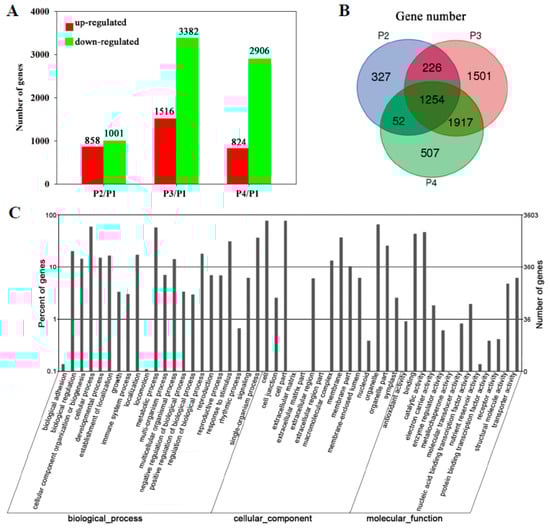 Figure 2. Transcriptomic profiling of banana peel during fruit ripening. (A) Numbers of differentially expressed genes in the peel at different stages of ripening. The numbers of up-regulated genes and down-regulated genes at different stages of ripening are indicated with red and green color, respectively; (B) Venn diagram illustrating the corresponding numbers of differentially expressed genes in different stages of ripening; (C) gene ontology term assignments based on significant plant species hits against the National Center for Biotechnology Information (NCBI) non- redundant (NR) database, according to the biological process, molecular function, and cellular component.