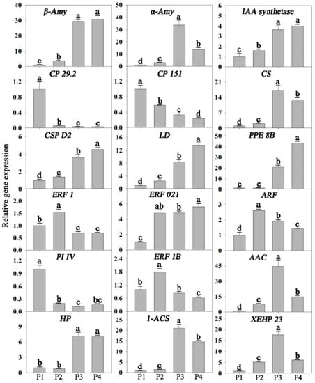 Figure 3. Validation of RNA-seq results by quantitative reverse transcription polymerase chain reaction (qRT-PCR). Eighteen differentially expressed genes related to signal transduction, transcription factors (TFs), photosynthesis, cell wall, starch, energy, respiration, and other metabolisms were selected for quantitative real-time PCR analysis. b-Amy, beta-amylase 3; a-Amy, alpha-amylase; GH 3.8, probable indole-3-acetic acid-amidosynthetase GH3.8; ARF, auxin-responsive family protein; ERF 021, putative ethylene-responsive transcription factor ERF021; ERF 1, putative ethylene-responsive transcription factor 1; CP 29.2, chlorophyll a-b binding protein CP29.2, chloroplastic; CP 151, chlorophyll a-b binding protein 151, chloroplastic; CS, citrate synthase; AAC, ADP, ATP carrier protein, mitochondrial; ERF 1B, ethylene-responsive transcription factor 1B; PI IV, Photosystem I reaction center subunit IV, chloroplastic; CSP D2, cellulose synthase-like protein D2; LD, Leucoanthocyanidin dioxygenase; PPE 8B, pectinesterase/pectinesterase inhibitor PPE8B; XEHP 23, xyloglucan endotransglucosylase/hydrolase protein 23; 1-ACS, 1-aminocyclopropane-1-carboxylate synthase; HP, Hypothetical protein. Values with different letters are significantly different (p < 0.05).
