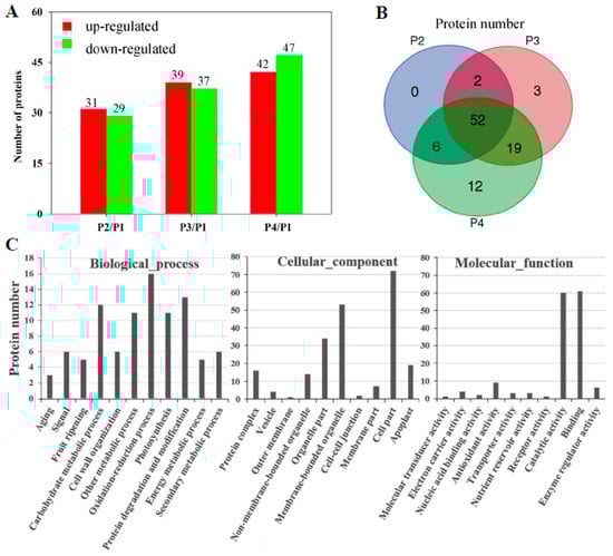 Figure 4. Differentially expressed proteins in the peel of banana fruit at different stages of ripening. Comparative proteomics of banana peel were performed using 2-DE coupled matrix-assisted laser desorption/ionization time-of-flight tandem mass spectrometry (MALDI-TOF MS/MS). (A) Numbers of differentially expressed proteins. The numbers of up-regulated proteins and down-regulated proteins are indicated with red and green color, respectively; (B) Venn diagram illustrating the corresponding numbers of differentially expressed proteins at different stages of ripening; (C) gene ontology term assignments based on significant plant species hits against the NR database, according to the biological process, molecular function, and cellular component.