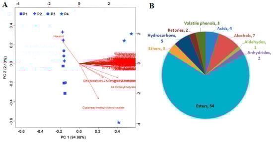 Figure 6. (A) Principal component analysis of differentially accumulated volatile compounds in the peel of banana fruit at different stages of ripening. All those compounds were specifically accumulated at P4 except one aldehyde. Detailed information is shown in Supplementary Table S1. (B) Classification of differentially accumulated volatile compounds in the peel of banana fruit at different stages of ripening.