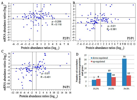 Figure 7. mRNA abundance ratios versus protein-abundance ratios. Ninety-four differentially expressed proteins and their corresponding genes were analyzed. The log 2 ratio of P2, P3, P4 to P1 at the mRNA level and the log1.5 ratio at the protein level were plotted against each other for each unique gene. The number of the correlative element between proteins and genes was counted and shown in the A, B, and C histogram. D, statistical count of up- or down-regulated elements between proteins and genes.