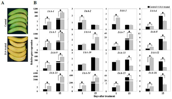 Figure 8. Effect of exogenous IAA treatment on fruit ripening and gene expression. (A) Visual appearance of banana fruit treated with 0.1 mM IAA after 15 d of storage. (B) Expression of selected ripening-related genes in the peel of banana fruit with 0.1 mM IAA after 1 and 15 days of storage. IAA-1, auxin-responsive family protein; IAA-2, OsSAUR57-auxin-responsive SAUR gene family member; IAA-3, auxin-induced protein 22D; IAA-4, OsSAUR37 - auxin-responsive SAUR gene family member; IAA-5, auxin-responsive family protein; IAA-6, SAUR family protein; IAA-7, 1-aminocyclopropane-1-carboxylate oxidase; IAA-8, ethylene-responsive transcription factor ERF024; IAA-9, 1-aminocyclopropane-1-carboxylate synthase; IAA-10, EIN3-binding F-box protein 1; IAA-11, ethylene receptor; IAA-12, ethylene-responsive transcription factor 1B; IAA-13, xyloglucan endotransglucosylase/hydrolase protein 32; IAA-14, polygalacturonase; IAA-15, pectinesterase/pectinesterase inhibitor 12; IAA-16, probable pectinesterase 53. Asterisk represents the statistical differences (p < 0.05) between control fruit and IAA-treated fruit.