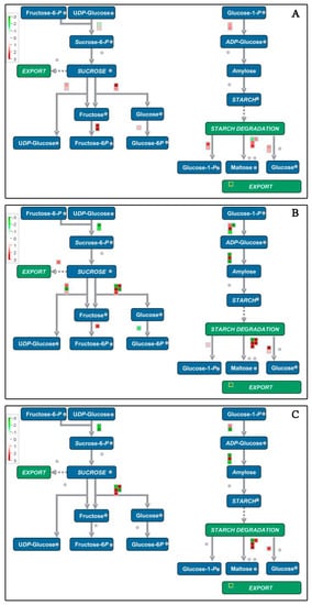 Figure 9. Schematic diagram of starch and sucrose metabolism using the MapMan visualization platform. The gene expression ratios of P2 (A), P3 (B), and P4 (C) compared with P1 were used in MapMan analysis. The red squares and green squares indicate up- or down-regulated genes involved in starch and sucrose metabolism, respectively.