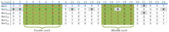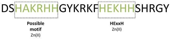 Histatin 5 (Hst5) is another histidine rich peptide found in saliva where it acts as first line of defence against oral candidiasis caused by Candida albicans [22,23,24]. In solution, Hst5 behaves as an IDP [25,26], but secondary structure elements can be induced under certain conditions [22,24,27]. Inherently, saliva contains various transition metals such as calcium, magnesium, zinc, nickel, copper, and iron [28]. Hst5 has been shown to bind Zn2+, Cu2+, and Fe2+/3+ ions [29,30,31], and it possesses defined metal binding motifs for copper (DSH, termed the ACTUN motif), nickel (DSH, ACTUN motif) [29], and zinc (a HExxH motif) [30]. Figure 1 displays the zinc-binding motif as well as the possible zinc-binding motif we suggest as a result of this article, to be discussed later.