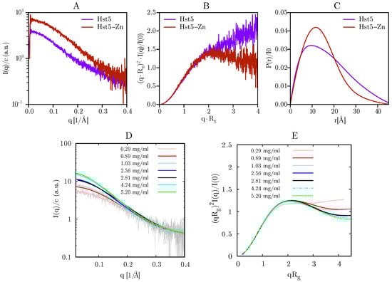 Investigation of the concentration dependence of the SAXS profiles as seen in Figure 3D showed that the mass-weighted distribution was affected by the protein concentration, and that the complexes increased in size with increasing protein concentration. Furthermore, precipitation was observed for high ratios of Zn2+:protein. The dimensionless Kratky plot (Figure 3E) showed that the oligomers obtained a more compact shape when compared to the random coil formation for the monomer, which was clearly visible for Hst5 at concentrations of 0.29 mg/mL. Furthermore, a plateau value was reached at a peptide concentration of around 5 mg/mL.