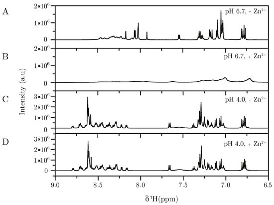 1H 1D NMR spectra of the aromatic region of Hst5 under different conditions. (A) pH 6.7, 150 mM NaCl, (B) pH 6.7, 150 mM NaCl, 4 mM ZnCl2 (C) pH 4.0, 150 mM NaCl and (D) pH 4.0, 150 mM NaCl, 4 mM ZnCl2. All spectra were recorded at 20 C.