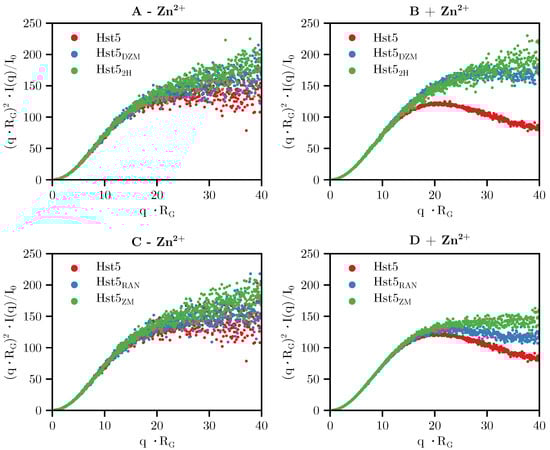 Kratky plots visualising the difference in shape between Hst5 in the absence and presence of Zn2+. (A,B) shows Hst5, Hst5DZM, and Hst52H in the absence and presence of Zn2+, respectively. (C,D) shows Hst5, Hst5RAN, and Hst5ZM in the absence and presence of Zn2+, respectively.