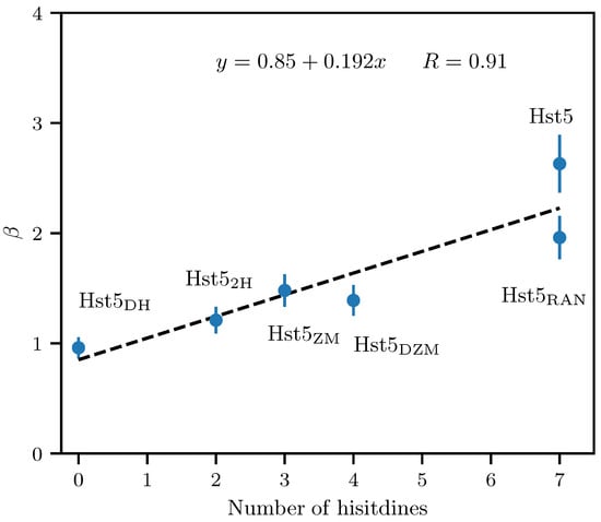 Correlation between the number of histidines and oligomerisation of Hst5 in the presence of Zn2+. The mass increase of the system defined as, β, see Equation (16), as a function of the number of histidines. Here β = 1.0 indicates no mass increase in the system i.e., no oligomerisation, whereas β > 1 does.