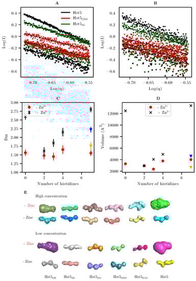 Since there were different degrees of mass increase corresponding to different sizes of oligomers formed in the different variants, this hampered the analyses of shape and Rg’s. Even though Hst5 is a short peptide, which decreases the probability to attain a large conformational ensemble, the variants generally possessed a more extended shape than Zn2+ bound Hst5, as seen in the Kratky plots in Figure 5. From the experimentally determined β-value, we noticed that upon addition of Zn2+, oligomers were formed when at least two histidines were present. Analysing the Kratky plot showed that Zn2+ addition resulted in a more compact shape, compared to a random coil (see Supplementary Figure S2). Chain expansion or collapse can be probed by SAXS by analysing the fractal dimension at intermediate q-range. In this region the intensity has a power law dependence on q, thus, by plotting log(I) against log(q), the mass fractal dimension, Dm, can be determined [40]. Unlike Rg and Rh, Dm is sensitive to the favourable or unfavourable solvation of the measured chains. Larger values of Dm reflect unfavourable interactions with the solvent, and more compact conformations. Figure 7A,B shows the linear fit for this region of the SAXS data for Hst5, as well as of the variants with a reduced number of histidines, for both concentrations measured. We note that although this region is expected to exist, the noise can be quite high and thus, we focused only on the high concentration measurements (values of Dm obtained for low concentrations samples are shown in Supplementary Figure S3B,D). In the absence of Zn2+, the measured Dm was invariant with the number of histidines. The estimated Dm of about 1.6 observed for all variants, (Figure 7C), was close to the expected value of a well solvated polymer (1.7), and agreed well with the shape observed in the Kratky plot [40]. Upon addition of Zn2+, Dm increased for all of the Hst5 variants. This increase could be caused by either a collapse of the polypeptide chain or the formation of oligomers. In the low concentration measurements, the observed differences in Dm were primarily observable in WT Hst5, and some effects were noticed for the randomised sequence. The increase is linear with the number of histidines present in the sequence apart from His5RAN and His5DH. It is therefore more likely that the increase in Dm corresponds to oligomer conformations of Hst5, which are less exposed to solvent [40]. To confirm this, the average scattering envelopes were calculated from the P(r) functions using DAMMIF, see models in Figure 7E.
