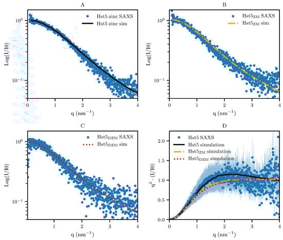 - Henriques, J.; Arleth, L.; Lindorff-Larsen, K.; Skepö, M. On the Calculation of SAXS Profiles of Folded and Intrinsically Disordered Proteins from Computer Simulations. J. Mol. Biol. 2018, 430, 2521–2539. [Google Scholar] [CrossRef] [PubMed]