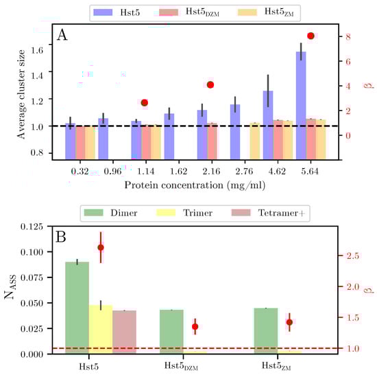 Distribution of oligomers determined by computer simulation for Hst5 and variants. (A) Average cluster size for Hst5 and variants as indicated determined by computer simulation. Shown for increasing concentrations of the respective protein. The scatter points correspond to the β values determined for Hst5 from SAXS (red y-axis). (B) Distribution of the formed clusters obtained by computer simulation, the bar chart corresponds to the determined Nass. Tetramer + corresponds to tetrameric and higher oligomers. The scatter points correspond to the β values determined from SAXS (red y-axis, as shown in Figure 7). The red and black dashed lines represents a β value of 1, i.e., a monomeric protein.