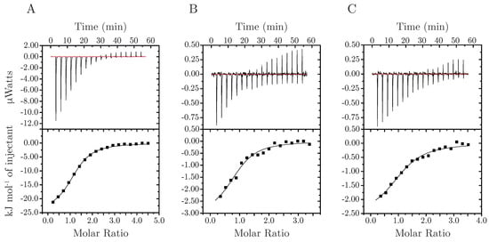 ITC measurements of interactions between Hst5 variants and Zn2+. Plots showing ITC data representative of the experiments. Titration of Zn2+ with (A) WT Hst5, (B) Hst5DZM, and (C) Hst5ZM.