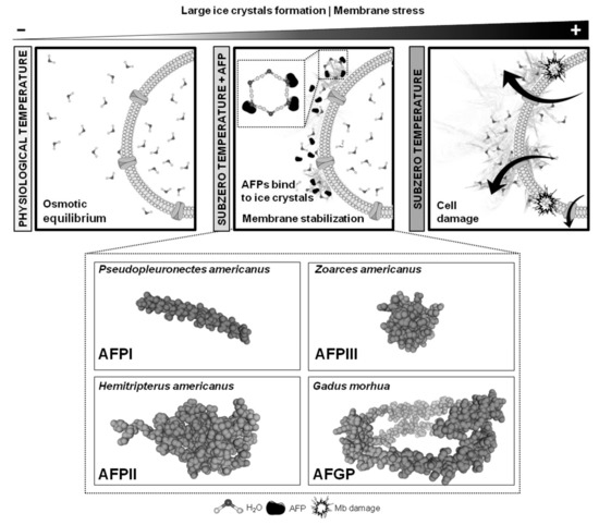 There are several species that naturally display a special protection against low temperatures thanks to their ability to produce an intriguing group of proteins that binds to ice, preventing ice crystal growth. These particular proteins, called antifreeze proteins (AFPs), could be present in bacteria, fungi, crustacean, microalgae, insects and fish (AFPs type I, II and II) [1,2,3,4,5,6,7,8,9,10,11,12,13] (Figure 1). In the natural environment, these proteins are crucial for animal survival at freezing temperatures. Thermal hysteresis and ice recrystallization inhibition, together with their ability to interact with biological membranes, are important properties of AFPs (Figure 1). It is interesting to notice that different AFPs could have a different activity and that they bind to different faces of the ice crystal [14]. Their ability to inhibit ice recrystallization is crucial to protecting membranes against freezing injuries [5,14,15,16,17,18,19]. This last property of AFPs, together with their capacity to interact with cellular membranes, makes these proteins interesting molecules for being incorporated in cryopreservation protocols. However, this property is dependent of the type of AFP and the type of membrane, i.e., the bilayer lipid composition of the membrane determines the interaction way with a specific AFP, as well as their protection ability [19].