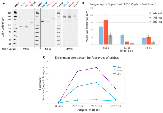 As previously reported, LASSOs hold superiority over traditional MIPs in cloning long genomic targets [1]. The hypothesis that the efficiency of pre-cloning capture is a function of AL was tested using single targets of known sizes while varying the AL (242 nt, 442 nt, and 788 nt) of a LASSO probe for the target. Experiments for three single targets of 0.6, 1.0, and 2.0 kb length were conducted to obtain a clearer observation of capture efficiency as a function of LASSO AL. Products of capture, namely the target–probe complexes, were subject to PAGE (Figure 2A). PAGE DNA quantification in Figure 2B demonstrated a two-tailed distribution of capturing efficiency for different ALs on each LASSO target. p-Values were respectively measured as 0.0068, 2.5 × 10−7, and 4.1 × 10−6 within the group of 0.6-, 1.0-, and 2.0-kb targets. Furthermore, the preference of AL also changes as target length varies. As the results show, targets 0.6 and 2.0kb in length prefer 442-nt adapters while 1.0 kb targets gain more captures with a 242-nt adapter. These results for single targets were also verified in library experiments involving the simultaneous capture of thousands of DNA targets with lengths varying from 400 to 5000 bp. LASSOs or MIPs with different adapters and the same extension and ligation arms were tested to capture different genes in the E. coli genome in independent experiments. As a pooled effect, probes with 442-nt AL provided the highest capture enrichment, found in the sequences produced by multiplex-DNA cloning. (Figure 2C) For all targets studied, MIP and LASSO with a 788-nt adapter provided less favorable efficiency compared with the other two LASSO adapter sizes. These empirical results suggest that longer LASSO probes are not necessarily better for a given target size.