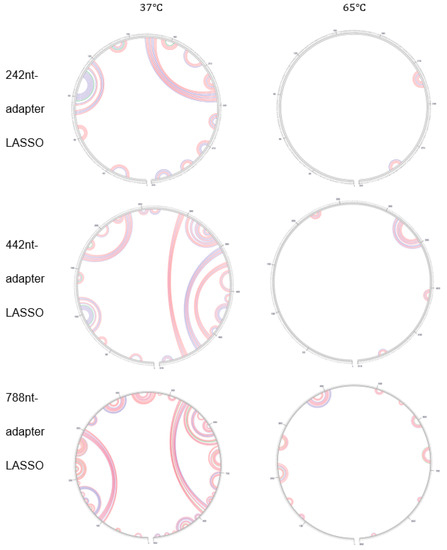 The efficiency of capture could be influenced by many factors. One hypothesis which may lead to the failure of the 788-nt adapter LASSO is the potential complex secondary structure that the probe might form due to its considerable length. Mfold [14] was applied to predict the secondary structures of the DNA LASSOs. Computations were conducted using input information representing the experimental LASSO conditions (T = 65 °C , ) corresponding to the results shown in Figure 2. The Mfold outputs show extremely complex secondary structures at 37 °C (tested as a reference) but largely reduced motifs at the experimental temperature (Figure 3).