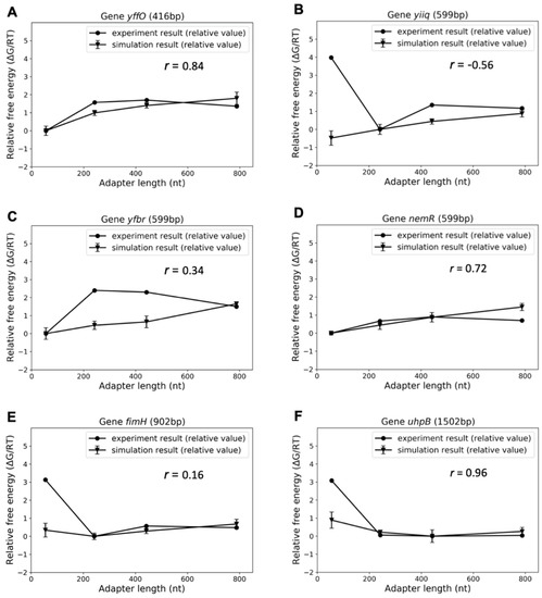 Comparison between free energy of probe–target interaction from experiments and simulation results. A–F represent six groups for data for six genes. The Pearson correlation coefficients are labeled as r value in the figures.