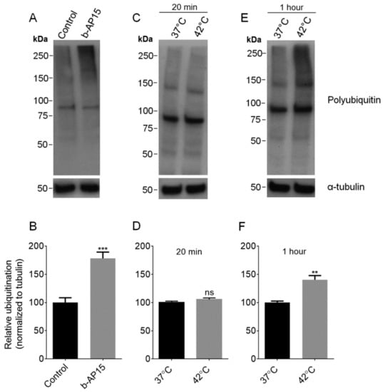 Analysis of the effect of b-AP15 and heat shock on the ubiquitination of proteins, using anti-ubiquitin antibody. Top panels: representative Western blots for ubiquitination and α-tubulin (as loading control) in HEK 293T cells after various treatments. Lower panels: the broad “smear” of ubiquitinated proteins from 50 kDa to the top of the gel was quantified using ImageJ and normalized to α-tubulin. Treatments: 1 µM b-AP15 in 0.05% DMSO for 1 h or control (0.05% DMSO alone) for 1 h (A,B); heat shock at 42 or 37 °C control for 20 min (C,D); heat shock at 42 or 37 °C control for 1 h (E,F). Error bars represent the standard error of mean (n = 6). ***, p ≤ 0.001 and **, p ≤ 0.01 using Student’s t-test; ns: not significant.