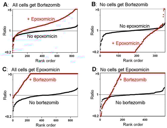 Previous studies found that the levels of some peptides were greatly reduced by the treatment of cells with proteasome inhibitors, including bortezomib (50 and 500 nM), epoxomicin (0.2 and 2 µM), and five other inhibitors [21,25,26,27]. However, many other peptides were elevated when cells were treated with bortezomib and MG262 [26,27]. Only a small number of peptides were greatly elevated by treatment with epoxomicin, and these were mainly peptides formed by proteasome β1 subunit-mediated cleavages (i.e., at residues with Glu or Asp in the P1 site) [21]. Because epoxomicin potently inhibits the β5 subunit and at higher concentrations also inhibits the β2 subunit, the increase in peptides resulting from cleavage at β1 sites presumably reflects the enhanced role of this subunit when the other two subunits are inhibited by epoxomicin [21]. In contrast, the elevated levels of peptides caused by bortezomib is not easily explained by this mechanism; most of the peptides elevated by bortezomib arise from cleavages at sites which fit the consensus for cleavage by the β5 subunit, which is the main target of bortezomib. Alternative hypotheses can potentially explain this apparent paradox, such as the possibility that bortezomib inhibits a non-proteasomal enzyme that degrades the proteasome-produced peptides. This and other possibilities were considered and discussed in our initial publication describing the paradoxical effect of bortezomib and in a subsequent study [26,27]. The present study further explores this apparent paradox by testing a combination of epoxomicin and bortezomib. Because epoxomicin is an irreversible inhibitor, it was predicted that this compound would prevent the bortezomib-mediated increase of intracellular peptides. However, this was not the observed result. Instead, the combination of bortezomib and epoxomicin produced an increase in more peptides than that produced by either compound alone (Figure 5). These observations are difficult to explain through off-target effects of bortezomib; if bortezomib inhibits another peptidase that degrades the proteasome products, epoxomicin should reduce the production of the proteasome products and ultimately result in lower levels of peptides. But when all cells were exposed to bortezomib, the addition of epoxomicin resulted in higher levels of peptides (Figure 6). This could potentially be explained by the off-target effects of epoxomicin, although this compound is generally considered to be highly specific for the proteasome [21,58].