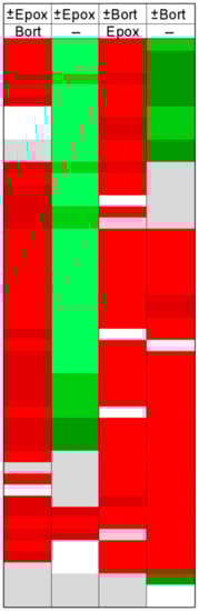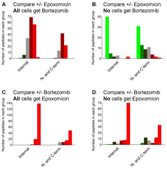 In previous studies, it was noted that 40–50% of the peptides found in HEK293T and other cell lines, and in mouse brain, represent the N- or C-terminus of the protein [5,20,25,26,27]. It was also noted that the treatment of cells with bortezomib caused an increase mainly in the fraction of peptides that represent internal fragments of their proteins [27]. Therefore, we examined the data from the present study by the location of the peptide within the protein precursor, comparing internal peptides with those derived from the N- or C-terminus of the protein. In the experiment testing the addition of epoxomicin in the presence of bortezomib, both groups of peptides showed a similar response to epoxomicin (Figure 7, panel A). In contrast, the addition of epoxomicin to cells in the absence of bortezomib caused a pronounced decrease in nearly all of the internal peptides but only a subset of the N- and C-terminal peptides (Figure 7, panel B; compare bright green bars versus other bars). The addition of bortezomib to cells treated with epoxomicin caused a large increase in internal peptides (Figure 7, panel C), which was similar to the effect of bortezomib in cells without epoxomicin (Figure 7, panel D).