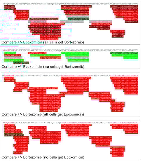 To compare peptides that are derived from the same protein, we selected heat shock 10-kDa protein 1 (gene name HSPE1) because a large number of peptides were found to be produced from this protein (Figure 6). This analysis is distinct from that of the heat map because all peptides derived from the protein are shown, not just those found in multiple experiments as shown in the heat map. The overall results from the analysis of HSPE1-derived peptides is similar to those from the analysis of peptides in the heat map; bortezomib produces a large increase in the levels of nearly all peptides regardless of whether epoxomicin is present, while the effect of epoxomicin is much different in cells treated with bortezomib versus cells without bortezomib (Figure 6). Three HSPE1-derived peptides were greatly increased when epoxomicin was tested alone (Figure 6, second panel; red bars). Of these three peptides, one was also increased when epoxomicin was added to cells treated with bortezomib, one was not affected by epoxomicin, and the third was not detected in the experiment comparing the addition of epoxomicin to bortezomib treated cells (Figure 6, top panel). In contrast, nearly all of the peptides found to decrease when the epoxomicin-treated cells were compared to the control cells (Figure 6, second panel; green bars) were elevated when cells treated with a combination of epoxomicin and bortezomib were compared to cells treated with bortezomib alone (top panel; red bars). In the experiments comparing the addition of bortezomib, either to the epoxomicin-treated cells (Figure 6, third panel) or to the control cells (fourth panel), many of the same HSPE1-derived peptides were detected and found to be greatly elevated by the addition of bortezomib.