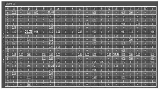 Residue pair frequency table of amino acid couple 27 and 28 (3DM numbering). In wild-type cupin-type P. furiosus phosphoglucose isomerase (PfPGI), these residues correspond to Pro132 and Tyr133. The correlated mutation analysis (CMA) scores are shown and are relative to the number of unique sequences containing such occurrences in the superfamily alignment.