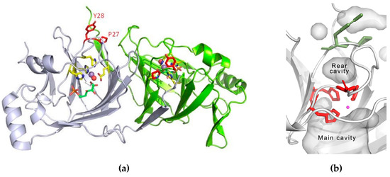 Structure details of wild-type PfPGI. (a) Cartoon representation of the dimer (white and green subunits) of the wild-type PfPGI Mn2+/5PAA 3D structure (Protein Data Bank (PDB) code: 1X7N). The correlated amino acid pair “PY” is indicated in red. Shown in yellow are those residues involved in manganese (purple sphere) binding, including a water molecule (red sphere). The inhibitor 5-phospho-D-arabinonate (5PAA) is shown as a stick model (green). (b) Location of main and rear cavities in PfPGI structure. Histidines 88, 90, and 136 separating main and rear cavities are shown as red sticks, Pro132 and Tyr133 separating rear-side cavity from solvent as green sticks, Mn2+ ion as magenta.