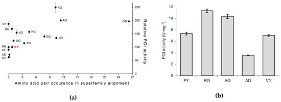 The results of activity measurement: (a) Graphical representation of the relative activity of each PfPGI mutant (Y-axis) compared to the amino acid pair occurrence according to the Comulator-based CMA predictions (X-axis). All phosphoglucose isomerase (PGI) activities are relative to wild-type P. furiosus PGI (PfPGI; PY; in red). (b) The specific activity of wild-type PfPGI (PY) compared to selected high-occurrence/activity mutants P132R/Y133G (RG) and P132A/Y133G (AG), and lower or similar occurrence/activity mutants P132A/Y133D (AD) and P132V (VY). Manganese was used as co-factor and added via titration.