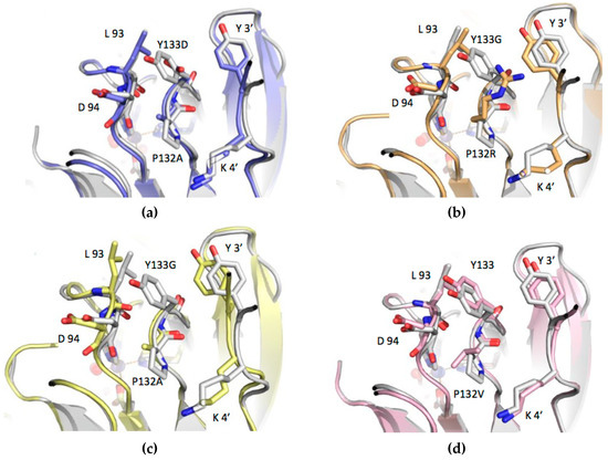 For the P132R–Y133G mutant (Figure 4b), the loss of the tyrosine side chain at position 133 is somewhat alleviated by the side chain of R132 occupying approximately the same position in the structure. There are movements of up to 0.5 Å in the positions of both the Leu93–Asp94 and Tyr3–Lys4 loops, compared to the structure of the wild-type enzyme. In the P132V (VY) single mutant (Figure 4d), the change of the proline side chain to valine pushes the Leu93–Asp94 loop away, in order to accommodate the larger bifurcated side chain of valine. Movements of 0.4 and 0.7 Å are seen between the Cαs of Leu93 and Asp94, respectively. In the mutant AD (Figure 4a), the movements of the alpha carbons of Leu93 and Asp94 away from 132–133 are 0.7 and 0.9 Å, respectively. In mutant AD, the change from tyrosine to the negatively-charged aspartic acid has little effect on the position of the side chain of Tyr3 from the adjacent subunit. In the P132A–Y133G mutant (Figure 4c), the changes to the position of Leu93 and Asp94 are more evident, with movements of 1.8 and 1.6 Å for the alpha carbons of Leu93 and Asp94, respectively, compared to the structure of the wild-type enzyme. Given that both mutations in this AG structure are to smaller residues than those in the wild-type, these fairly large movements are, somewhat counter-intuitively, away from the 132–133 pair, presumably making the packing worse. Instead, the 131–134 loop stays packed against the Tyr3 and Leu4 residues from chain B of the homodimer, similar to a lock in all other structures, which is absent in the monomer AG mutant (Figure 4c). The conformation of the loops near the 131–134 loop in all the investigated structures leads to the formation of a rear-side cavity with a different volume, as well as the lining up of a variety of residue side chains around it.