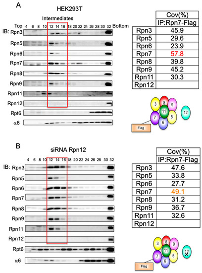 Rpn12 is incorporated at the final step of lid formation. (A) HEK293T cells stably expressing Rpn7-Flag were lysed and subjected to 4%–24% glycerol gradient centrifugation. The fractions were analyzed by immunoblotting with anti-Rpn3, Rpn5–Rpn9, Rpn11, Rpn12, Rpt6, and α6 antibodies. Fractions corresponding to the accumulated complexes (boxed in red) were immunoprecipitated (IP) with the anti-Flag antibody. The precipitated complexes were analyzed by LC-MALDI followed by tandem mass spectrometry. The table shows the sequence coverage of the identified subunits. (B) siRNA targeting Rpn12 was transfected into HEK293T cells for 48 h and then analyzed as described in Figure 2A.