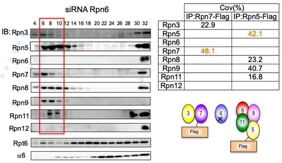 Rpn6 is required for the interaction between Rpn3-7-15 and Rpn5-8-9-11, and for Rpn11 stability. HEK293T cells stably expressing Rpn5-Flag and Rpn7-Flag treated with siRNA targeting Rpn6 for 48 h were analyzed in the same way as described in Figure 2. The table shows the sequence coverage of the identified subunits.