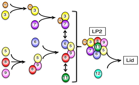 Previous studies from yeast Saccharomyces cerevisiae have demonstrated that the assembly of the proteasome lid begins with the formation of two modular complexes: Rpn3-7-15 and Rpn5-6-8-9-11 [24,29,30]. These two modules are assembled, followed by the incorporation of Rpn12 that completes the lid assembly and drives lid–base joining.