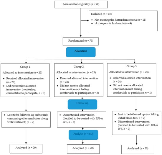 In the present study, the initial sample consisted of 90 women with PCOS, from whom 11 were excluded because they did not meet the Rotterdam criteria, and 4 women’s husbands suffered from azoospermia. Then, 75 participants were randomly allocated into 3 groups including group 1: CC (n = 25); group 2: herbal mixture (n = 25); and group 3: CC with herbal mixture (n = 25). Twenty-two women out of 25 in group 1, 23 out of 25 in group 2, and 24 out of 25 in group 3 received allocated interventions. However, 3, 2, and 1 of them in groups 1, 2, and 3, respectively, did not feel comfortable enough to participate. During the follow-up stage, 2 participants in group 1 were lost to be followed up with because of consuming other medication along with treatment, 3 of them in group 2 discontinued intervention on account of deciding to get treated with intrauterine insemination (IUI) or in vitro fertilization (IVF), and 2 of them in group 3 did not take an initial blood test, while 2 of them wanted to be treated with IUI or IVF. Finally, 60 participants (n = 20 in each group) finalized the intervention and their blood samples were analyzed at the end of three months (Figure 2).