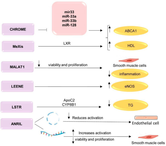 The CHROME (cholesterol homeostasis regulator of miRNA expression) lncRNA is a lncRNA that regulates systemic cholesterol homeostasis in the liver and macrophages by inhibiting miRNAs such as miR-33 (Figure 3) [108]. The knockdown of CHROME in human hepatocytes and macrophages increases the miR-27b, miR-33a, miR-33b and miR-128 levels. As a result, the expression of their overlapping target gene networks and their associated biological functions are reduced. In particular, cells without CHROME showed a reduced expression of ABCA1, which regulates cholesterol outflow and the formation of nascent HDL particles. Thus, CHROME is one of the key noncoding RNAs that control cholesterol homeostasis in humans, and it can have protective properties against atherosclerosis [108].