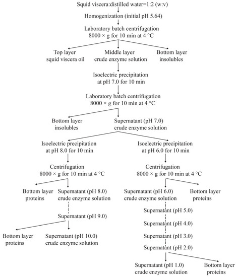 Figure 1. Schematic illustration of the procedures for extraction of proteases from neon flying squid viscera using isoelectric solubilization/precipitation.