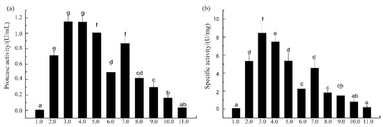 When SVCEs were extracted under extreme acidic or alkaline pH conditions, such as pH 1.0 and pH 10.0, the protease activity of SVCEs, as well as their specific activity, was much lower compared to other groups of pH ranges. The largest protease activities of SVCEs were detected for the group with extraction pH ranges of 3.0–4.0 (Figure 2a). Furthermore, the SVCEs obtained at pH 3.0, designated as SVCE3, showed the highest specific activity, i.e., 8.21 U/mg (Figure 2b).
