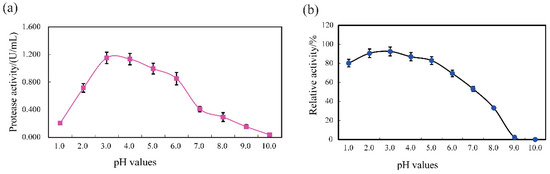 Figure 4. pH profile (a) and pH stability (b) of SVCE3(f) from squid viscera measured with casein substrate at 40 °C.