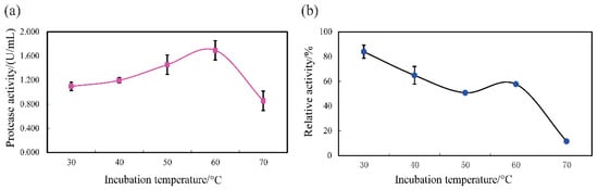 After incubation at different temperatures (30–70 °C) for 10 min in lactic acid buffer (50 mM, pH 3.0), the protease activity of SVCE3(f) was measured according to the method described in Section 2.3. The stability of SVCE3(f), incubated at different temperatures (30–70 °C) for 60 min, was evaluated based on its residual protease activities under standard assay conditions.