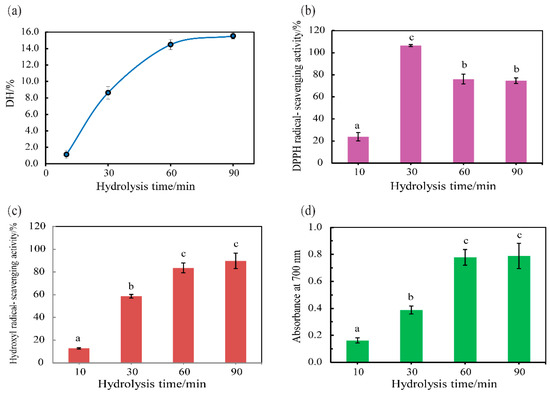 Figure 6. Antioxidant activity of half-fin anchovy hydrolysates digested with SVCE3(f) at different times. (a) Degree of hydrolysis, (b) DPPH scavenging activity, (c) hydroxyl radical scavenging activity, and (d) ferric reducing power. Data were presented as mean ± SD (n = 3). Different letters represent significant differences (p < 0.05).